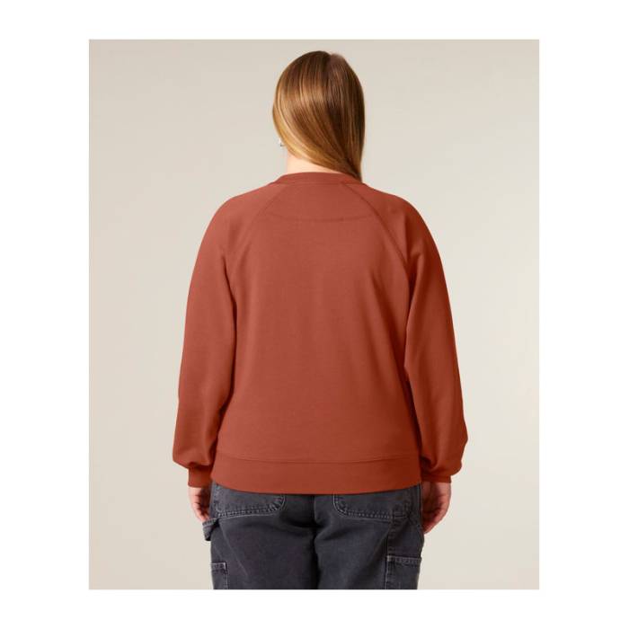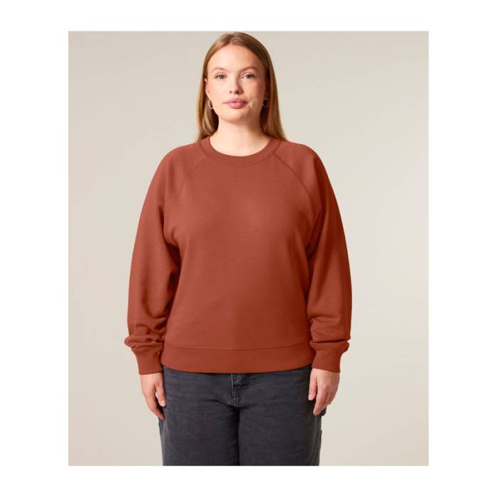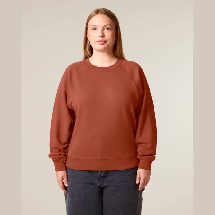 Prémium minőségű, 300 g/m² organikus pamutból készült pulóver, amely raglán ujjaival idézi a klasszikus sportos stílust. Kiemeli az alakot, nőies nyakkivágással rendelkezik. Ideális mindennapi viselethez és egyedi mintákhoz.