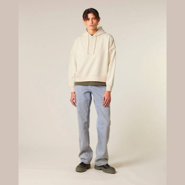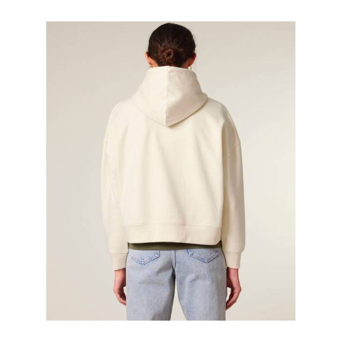 Prémium minőségű női kapucnis pulóver, amely letisztult megjelenést biztosít a leengedett vállrészekkel és finom részletekkel.100% organikus pamutból készült, 300 g/m² súlyú anyag, amely tökéletesen alkalmas egyedi emblémázáshoz.