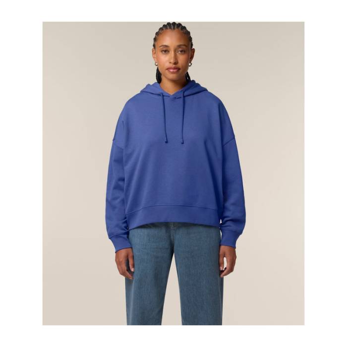 Prémium minőségű női kapucnis pulóver, amely letisztult megjelenést biztosít a leengedett vállrészekkel és finom részletekkel.100% organikus pamutból készült, 300 g/m² súlyú anyag, amely tökéletesen alkalmas egyedi emblémázáshoz.