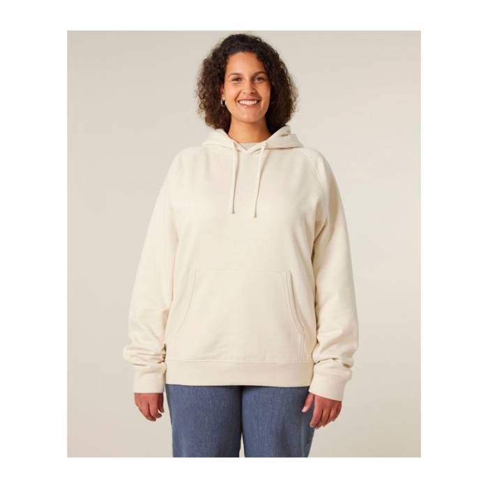 Retro stílusú, uniszex kapucnis pulóver raglán ujjakkal, dupla rétegű kapucnival és kenguruzsebbel. 100% organikus pamutból készült, 400 g/m² súlyú anyagból, amely kényelmes és laza viseletet biztosít. Kiválóan alkalmas személyre szabásra.