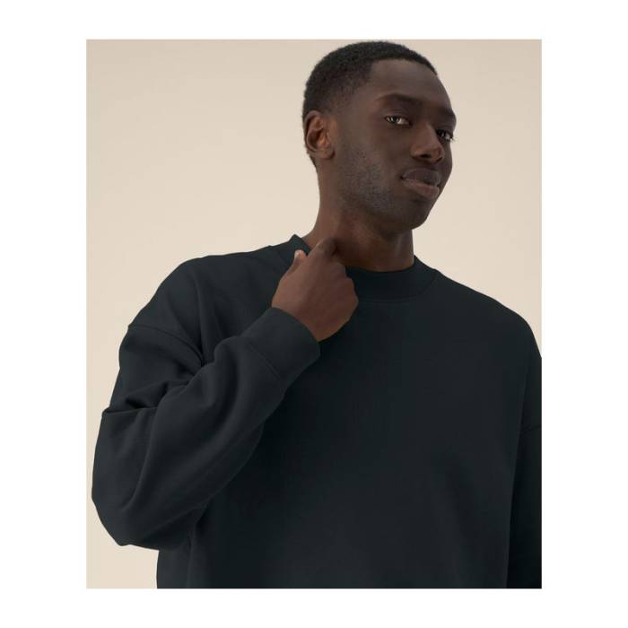 A The Ryler egy puha, újrahasznosított pamutkeverékből készült kereknyakú pulóver. Divatos „boxy” fazonja tökéletes egyensúlyt teremt a kényelem, a tartás és a modern megjelenés között. A bevarrt ujjak, a mandzsetták és az alsó szegély 1x1-es bordás kötése, valamint a teljes felületen alkalmazott ikertűs tűzés garantálják a hosszantartó minőséget. Belül halszálka mintás nyakszalag és alapszövetből készült félhold alakú tarkóbetét biztosít tiszta, prémium kidolgozást. Életstílus-márkákhoz, zenei merchandise termékekhez és trendkövető kollekciókhoz tervezték; kiválóan emblémázható, így ideális választás fenntartható, egyedi printekhez.