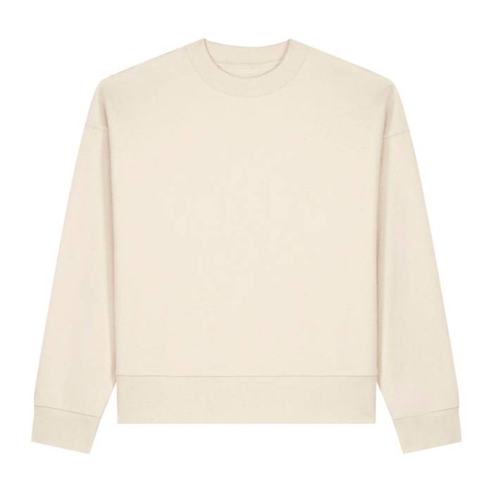 A The Ryler egy puha, újrahasznosított pamutkeverékből készült kereknyakú pulóver. Divatos „boxy” fazonja tökéletes egyensúlyt teremt a kényelem, a tartás és a modern megjelenés között. A bevarrt ujjak, a mandzsetták és az alsó szegély 1x1-es bordás kötése, valamint a teljes felületen alkalmazott ikertűs tűzés garantálják a hosszantartó minőséget. Belül halszálka mintás nyakszalag és alapszövetből készült félhold alakú tarkóbetét biztosít tiszta, prémium kidolgozást. Életstílus-márkákhoz, zenei merchandise termékekhez és trendkövető kollekciókhoz tervezték; kiválóan emblémázható, így ideális választás fenntartható, egyedi printekhez.