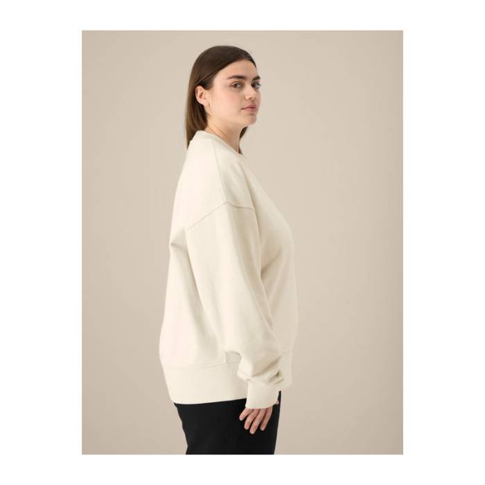 A The Ryler egy puha, újrahasznosított pamutkeverékből készült kereknyakú pulóver. Divatos „boxy” fazonja tökéletes egyensúlyt teremt a kényelem, a tartás és a modern megjelenés között. A bevarrt ujjak, a mandzsetták és az alsó szegély 1x1-es bordás kötése, valamint a teljes felületen alkalmazott ikertűs tűzés garantálják a hosszantartó minőséget. Belül halszálka mintás nyakszalag és alapszövetből készült félhold alakú tarkóbetét biztosít tiszta, prémium kidolgozást. Életstílus-márkákhoz, zenei merchandise termékekhez és trendkövető kollekciókhoz tervezték; kiválóan emblémázható, így ideális választás fenntartható, egyedi printekhez.