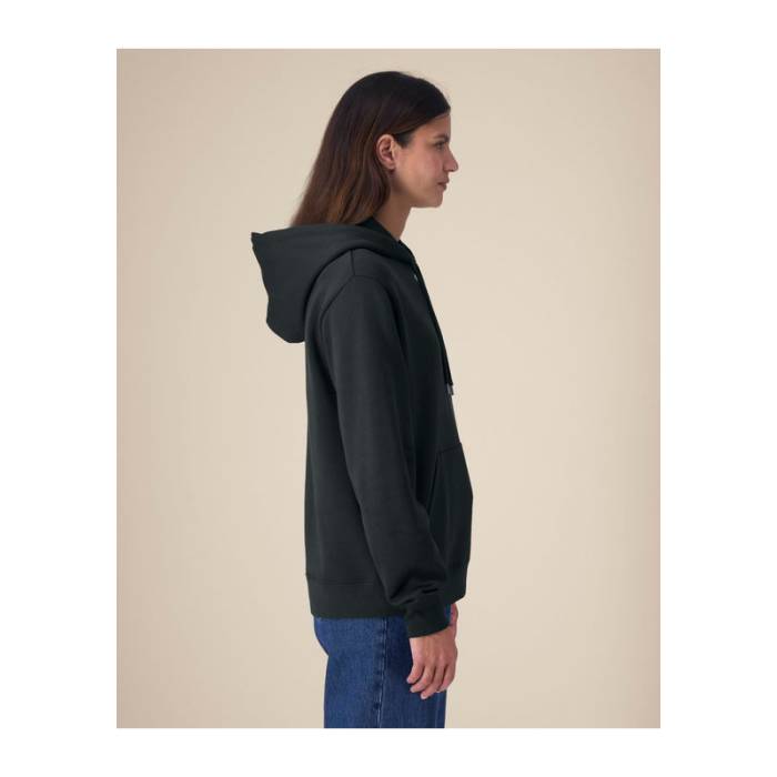 A The Stella Gamechanger egy puha, újrahasznosított pamutkeverékből készült női kapucnis pulóver. Letisztult, klasszikus szabása miatt kiváló céges brandinghez, lifestyle kollekciókhoz és mindennapi viseletnek. Duplarétegű kapucnival, fémvégű húzózsinórral és hímzett zsinórvezető lyukakkal rendelkezik az igényes megjelenésért. Az ikertűs tűzés a mandzsettákon és az alján biztosítja a tartósságot, míg a kenguru zseb és a halszálka mintás nyakszalag kényelmet és praktikusságot nyújt. Ez a környezetbarát modell sima felületet biztosít nyomtatáshoz vagy hímzéshez, ötvözve a fenntarthatóságot az időtlen stílussal.