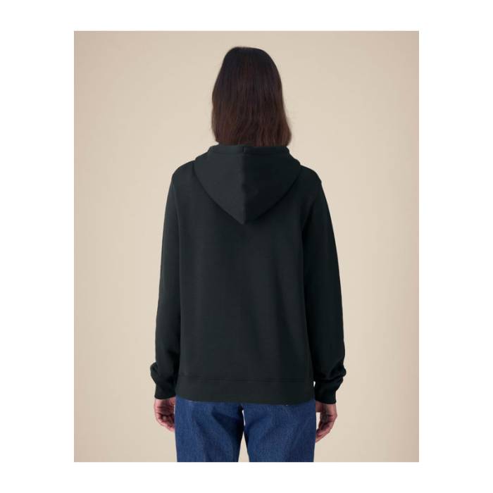A The Stella Gamechanger egy puha, újrahasznosított pamutkeverékből készült női kapucnis pulóver. Letisztult, klasszikus szabása miatt kiváló céges brandinghez, lifestyle kollekciókhoz és mindennapi viseletnek. Duplarétegű kapucnival, fémvégű húzózsinórral és hímzett zsinórvezető lyukakkal rendelkezik az igényes megjelenésért. Az ikertűs tűzés a mandzsettákon és az alján biztosítja a tartósságot, míg a kenguru zseb és a halszálka mintás nyakszalag kényelmet és praktikusságot nyújt. Ez a környezetbarát modell sima felületet biztosít nyomtatáshoz vagy hímzéshez, ötvözve a fenntarthatóságot az időtlen stílussal.