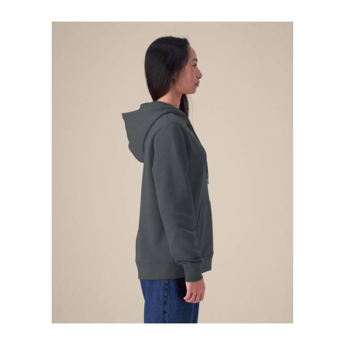 A The Stella Gamechanger egy puha, újrahasznosított pamutkeverékből készült női kapucnis pulóver. Letisztult, klasszikus szabása miatt kiváló céges brandinghez, lifestyle kollekciókhoz és mindennapi viseletnek. Duplarétegű kapucnival, fémvégű húzózsinórral és hímzett zsinórvezető lyukakkal rendelkezik az igényes megjelenésért. Az ikertűs tűzés a mandzsettákon és az alján biztosítja a tartósságot, míg a kenguru zseb és a halszálka mintás nyakszalag kényelmet és praktikusságot nyújt. Ez a környezetbarát modell sima felületet biztosít nyomtatáshoz vagy hímzéshez, ötvözve a fenntarthatóságot az időtlen stílussal.
