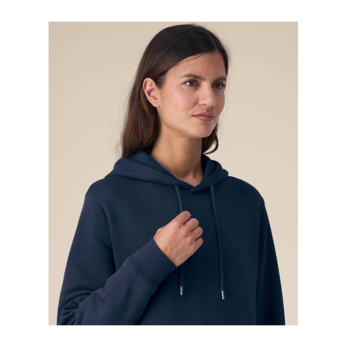 A The Stella Gamechanger egy puha, újrahasznosított pamutkeverékből készült női kapucnis pulóver. Letisztult, klasszikus szabása miatt kiváló céges brandinghez, lifestyle kollekciókhoz és mindennapi viseletnek. Duplarétegű kapucnival, fémvégű húzózsinórral és hímzett zsinórvezető lyukakkal rendelkezik az igényes megjelenésért. Az ikertűs tűzés a mandzsettákon és az alján biztosítja a tartósságot, míg a kenguru zseb és a halszálka mintás nyakszalag kényelmet és praktikusságot nyújt. Ez a környezetbarát modell sima felületet biztosít nyomtatáshoz vagy hímzéshez, ötvözve a fenntarthatóságot az időtlen stílussal.