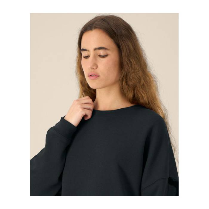 A The Stella Lianna egy sima felületű bio pamut-TENCEL™ Modal keverékből készült női kereknyakú pulóver. Puha tapintást, légáteresztő kényelmet és lezser szabást biztosít. Természetes lágy esésével és nőies formájával könnyed viselet, miközben az ikertűs tűzés és az előrehelyezett oldalvarrások megőrzik a ruhadarab szerkezetét. A 1x1-es bordás kötés a nyaknál és a szegélyeken finom textúrát ad, a belső halszálka mintás nyakszalag pedig teljessé teszi a prémium kidolgozást. Ez a trendi felső könnyű, mégis otthonos, tökéletes választás olyan kollekciókhoz, ahol a puhaság és a kiváló nyomtathatóság a fő szempont.