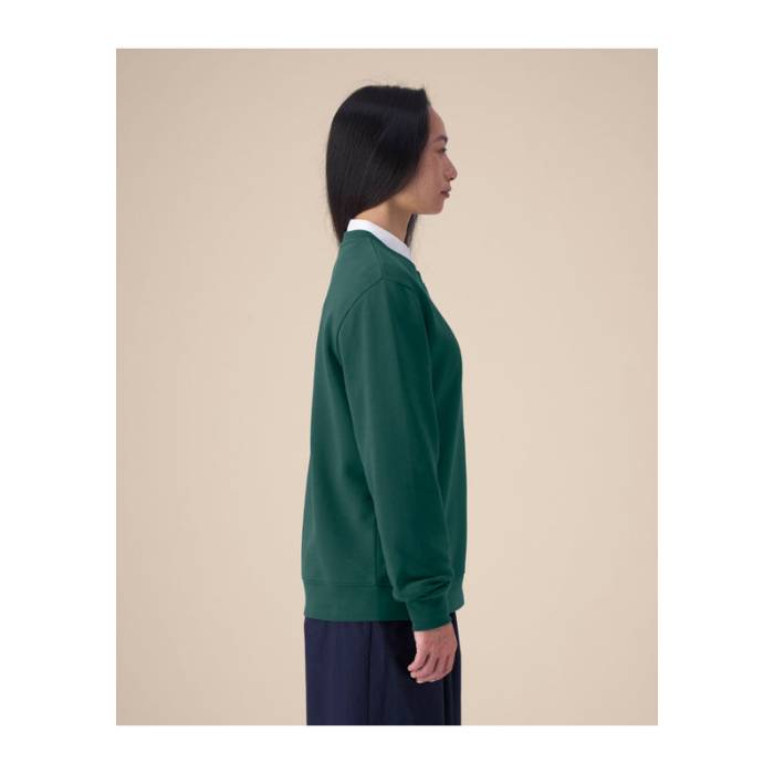 A The Stella Thinker egy puha, újrahasznosított pamutkeverékből készült női pulóver. Letisztult szabása és puha tapintása hosszantartó kényelmet és mindennapi sokoldalúságot kínál. Üzleti viseletnek, lifestyle márkákhoz és brandingelt kollekciókhoz tervezték; bevarrt ujjakkal, bordás passzékkal és ikertűs tűzéssel készült az alaktartás érdekében. A belső halszálka mintás nyakszalag és a félhold alakú tarkóbetét finom belső részleteket adnak. Ez a fenntartható pulóver sima és megbízható alapot nyújt hímzéshez vagy nyomtatáshoz – ideális céges logózáshoz és környezetbarát kollekciókhoz.