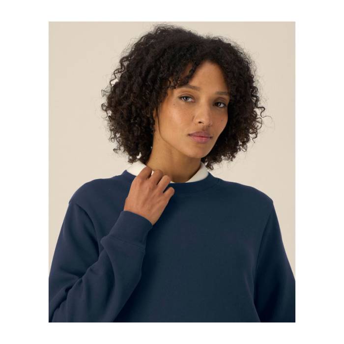 A The Stella Thinker egy puha, újrahasznosított pamutkeverékből készült női pulóver. Letisztult szabása és puha tapintása hosszantartó kényelmet és mindennapi sokoldalúságot kínál. Üzleti viseletnek, lifestyle márkákhoz és brandingelt kollekciókhoz tervezték; bevarrt ujjakkal, bordás passzékkal és ikertűs tűzéssel készült az alaktartás érdekében. A belső halszálka mintás nyakszalag és a félhold alakú tarkóbetét finom belső részleteket adnak. Ez a fenntartható pulóver sima és megbízható alapot nyújt hímzéshez vagy nyomtatáshoz – ideális céges logózáshoz és környezetbarát kollekciókhoz.