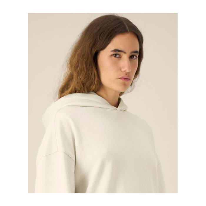 A The Voicer egy puha, újrahasznosított pamutkeverékből készült kapucnis pulóver. Olyan márkák számára készült, amelyek értékelik a modern stílust és a fenntarthatóságot, miközben kiemelkedő kényelmet biztosítanak. A divatos „boxy” szabás és a kétrétegű, azonos anyagú kapucni letisztult, kortárs megjelenést kölcsönöz – ideális választás lifestyle kollekciókhoz és zenei merchandise-hoz. A mandzsetták és az alsó szegély 1x1-es bordás passzéja, valamint a tartós ikertűs tűzés biztosítja a ruhadarab élettartamát. Legyen szó merész grafikákról vagy finom hímzésről, a The Voicer sokoldalú alapdarab a kreatív önkifejezéshez.