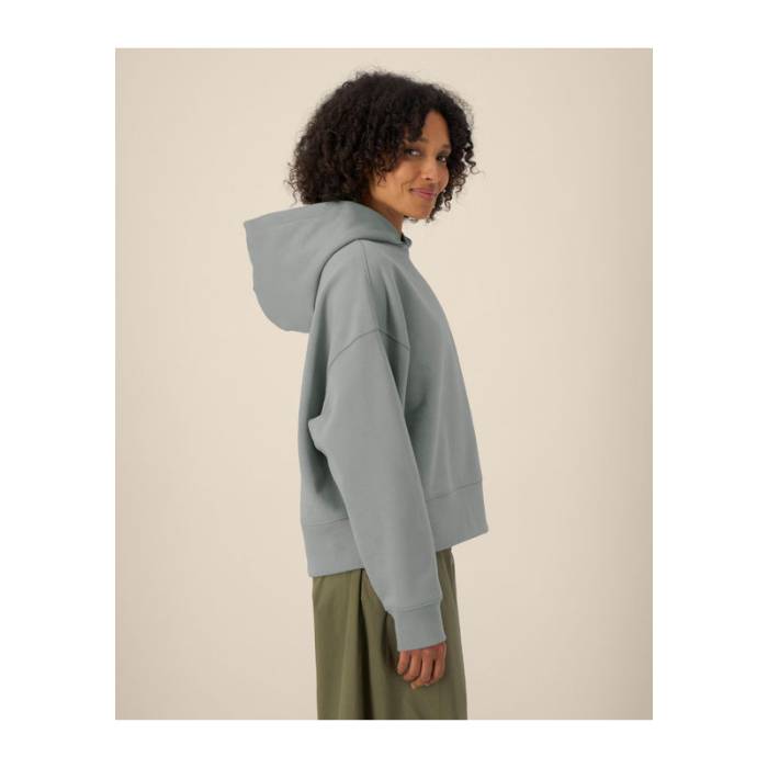 A The Voicer egy puha, újrahasznosított pamutkeverékből készült kapucnis pulóver. Olyan márkák számára készült, amelyek értékelik a modern stílust és a fenntarthatóságot, miközben kiemelkedő kényelmet biztosítanak. A divatos „boxy” szabás és a kétrétegű, azonos anyagú kapucni letisztult, kortárs megjelenést kölcsönöz – ideális választás lifestyle kollekciókhoz és zenei merchandise-hoz. A mandzsetták és az alsó szegély 1x1-es bordás passzéja, valamint a tartós ikertűs tűzés biztosítja a ruhadarab élettartamát. Legyen szó merész grafikákról vagy finom hímzésről, a The Voicer sokoldalú alapdarab a kreatív önkifejezéshez.