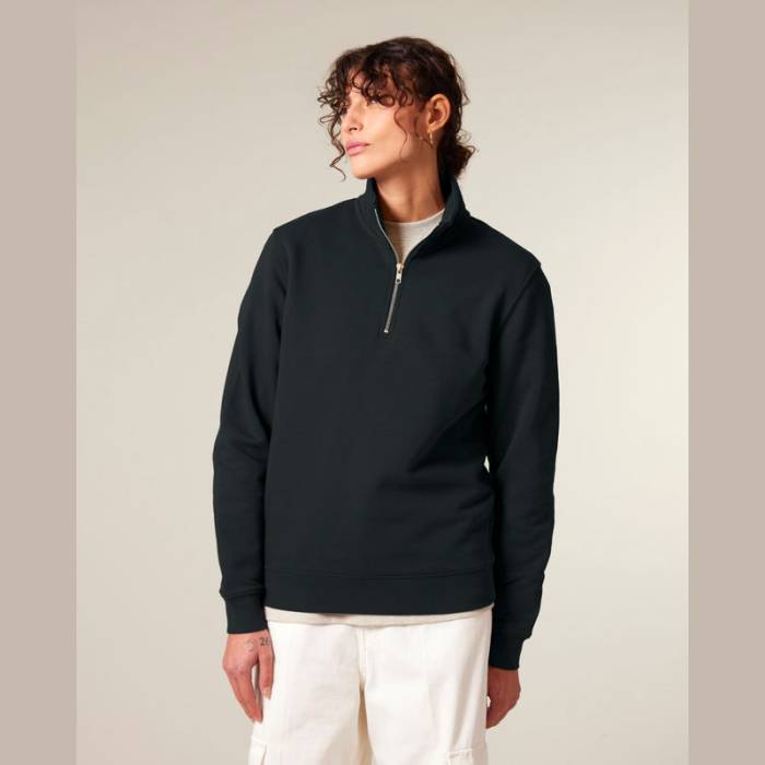 Uniszex negyed cipzáras pulóver modern szabással. 85% organikus pamutból és 15% újrahasznosított poliészterből készült.