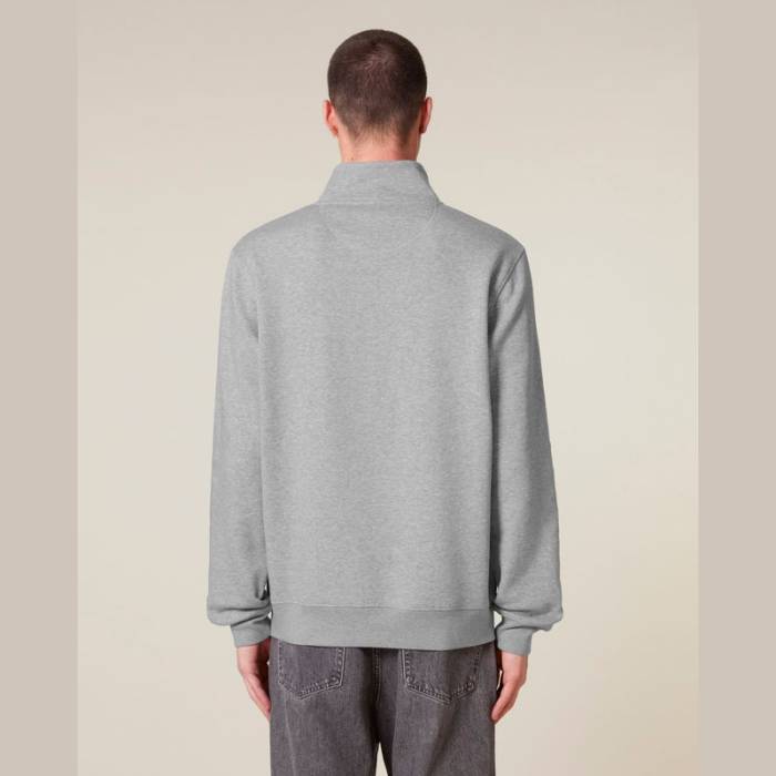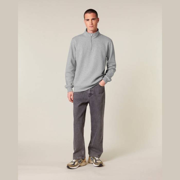 Uniszex negyed cipzáras pulóver modern szabással. 85% organikus pamutból és 15% újrahasznosított poliészterből készült.