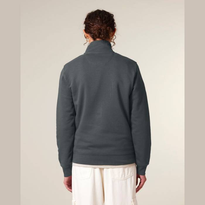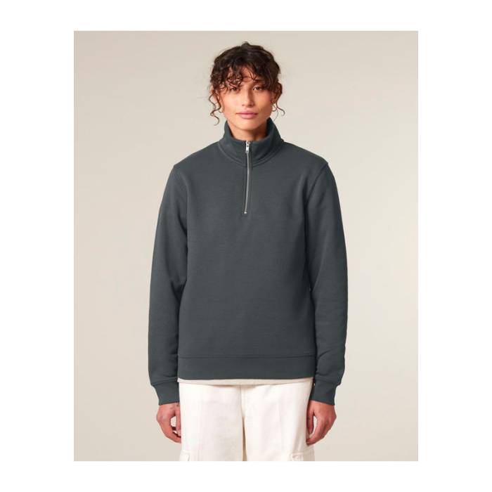 Uniszex negyed cipzáras pulóver modern szabással. 85% organikus pamutból és 15% újrahasznosított poliészterből készült.