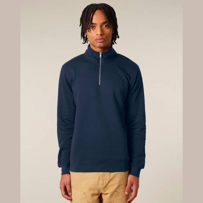 Uniszex negyed cipzáras pulóver modern szabással. 85% organikus pamutból és 15% újrahasznosított poliészterből készült.