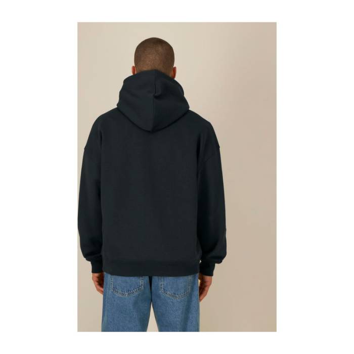 Bevarrt ujjak. Az anyagával bélelt kapucni. 1x1 bordás mandzsetta az ujjak végén és az alsó szegélynél. Kenguruzseb. Halszálkamintás szalag a nyak belső részén. Félhold alakú betét a hátsó nyakrészben.