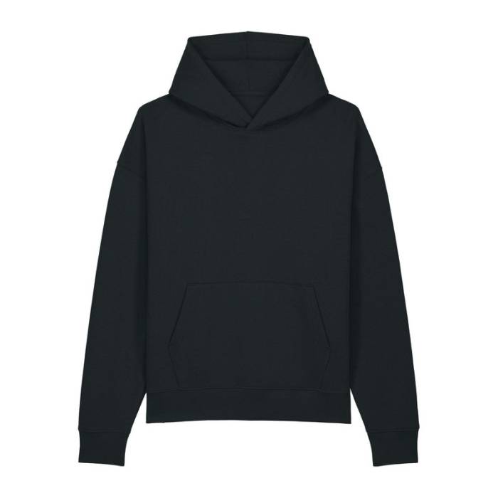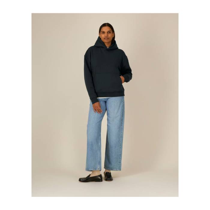 Bevarrt ujjak. Az anyagával bélelt kapucni. 1x1 bordás mandzsetta az ujjak végén és az alsó szegélynél. Kenguruzseb. Halszálkamintás szalag a nyak belső részén. Félhold alakú betét a hátsó nyakrészben.
