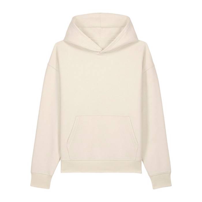 Bevarrt ujjak. Az anyagával bélelt kapucni. 1x1 bordás mandzsetta az ujjak végén és az alsó szegélynél. Kenguruzseb. Halszálkamintás szalag a nyak belső részén. Félhold alakú betét a hátsó nyakrészben.