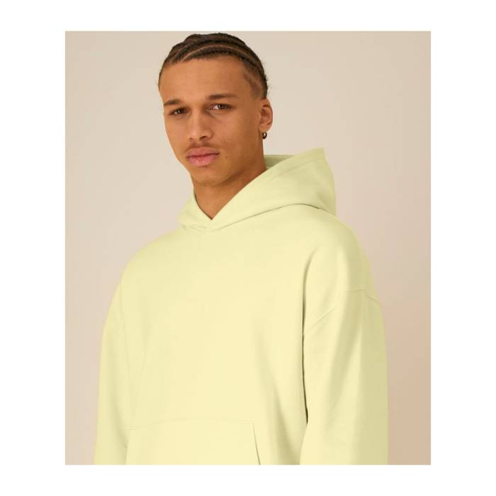 Bevarrt ujjak. Az anyagával bélelt kapucni. 1x1 bordás mandzsetta az ujjak végén és az alsó szegélynél. Kenguruzseb. Halszálkamintás szalag a nyak belső részén. Félhold alakú betét a hátsó nyakrészben.