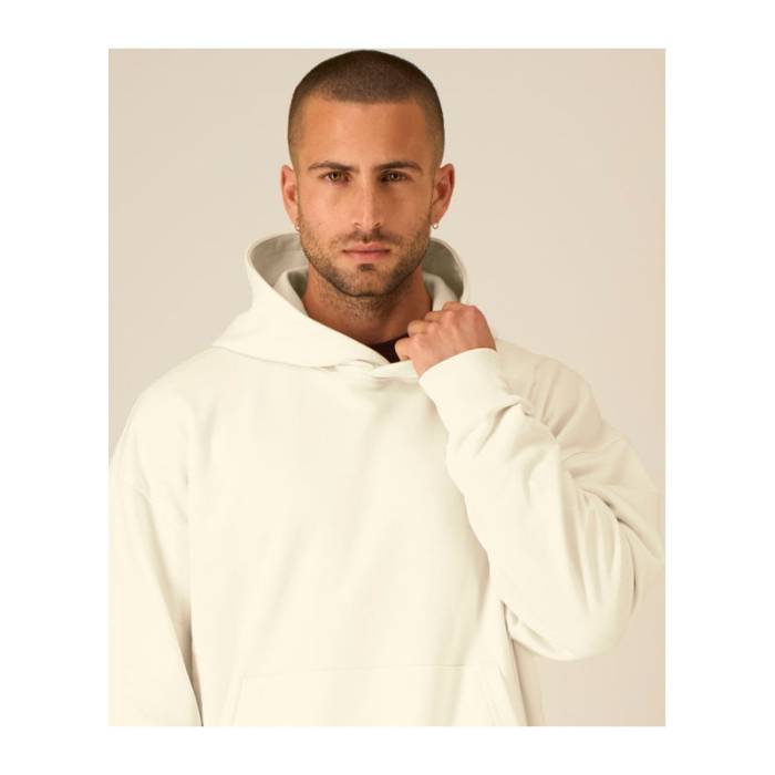 Bevarrt ujjak. Az anyagával bélelt kapucni. 1x1 bordás mandzsetta az ujjak végén és az alsó szegélynél. Kenguruzseb. Halszálkamintás szalag a nyak belső részén. Félhold alakú betét a hátsó nyakrészben.