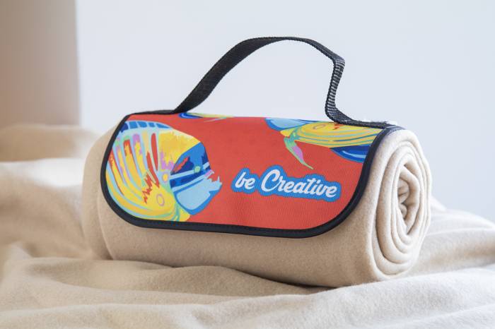 Egyedi gyártású, RPET polár polár takaró (200 g/m²) tépőzáras fogantyúval 600D RPET poliészterből. Szublimációs emblémázással és megkülönböztető RPET címkével. Minimális rendelési mennyiség: 25 db.