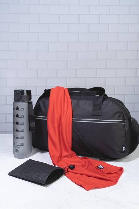 RPET mikroszálas sporttörölköző RPET non-woven hordtáskában, megkülönböztető RPET címkével. RPET poliészter, 140 g/m².