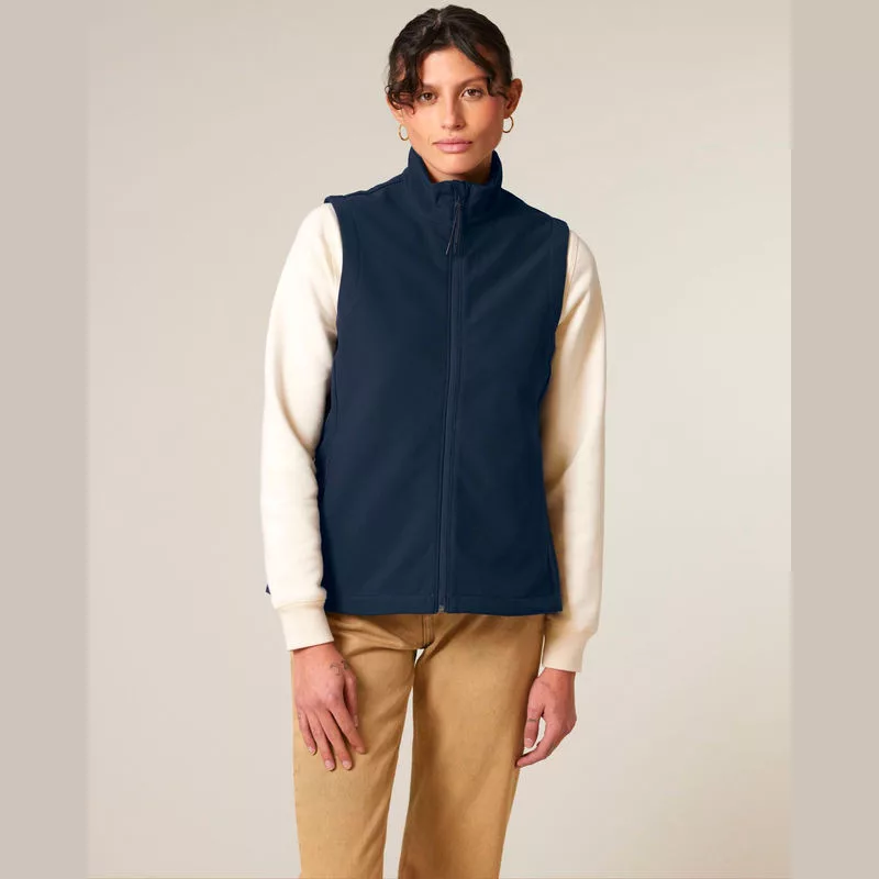 Stílusos, légáteresztő és szélálló mellény, állítható szegéllyel, fényvisszaverő cipzárokkal. Újrahasznosított anyagokból készült.