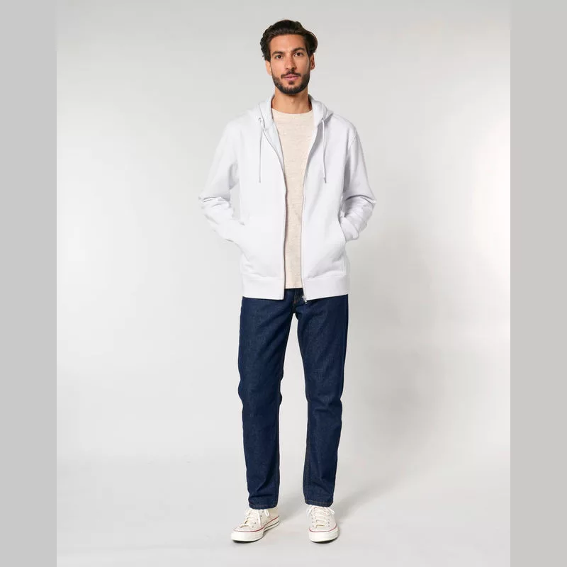 Stílusos, 350 g/m² súlyú, bolyhosított polár kapucnis pulóver modern szabásvonallal, teljes cipzárral és kenguruzsebekkel rendelkezik. 100% organikus pamutból készült.