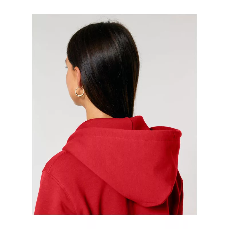 Stílusos, 350 g/m² súlyú, bolyhosított polár kapucnis pulóver modern szabásvonallal, teljes cipzárral és kenguruzsebekkel rendelkezik. 100% organikus pamutból készült.