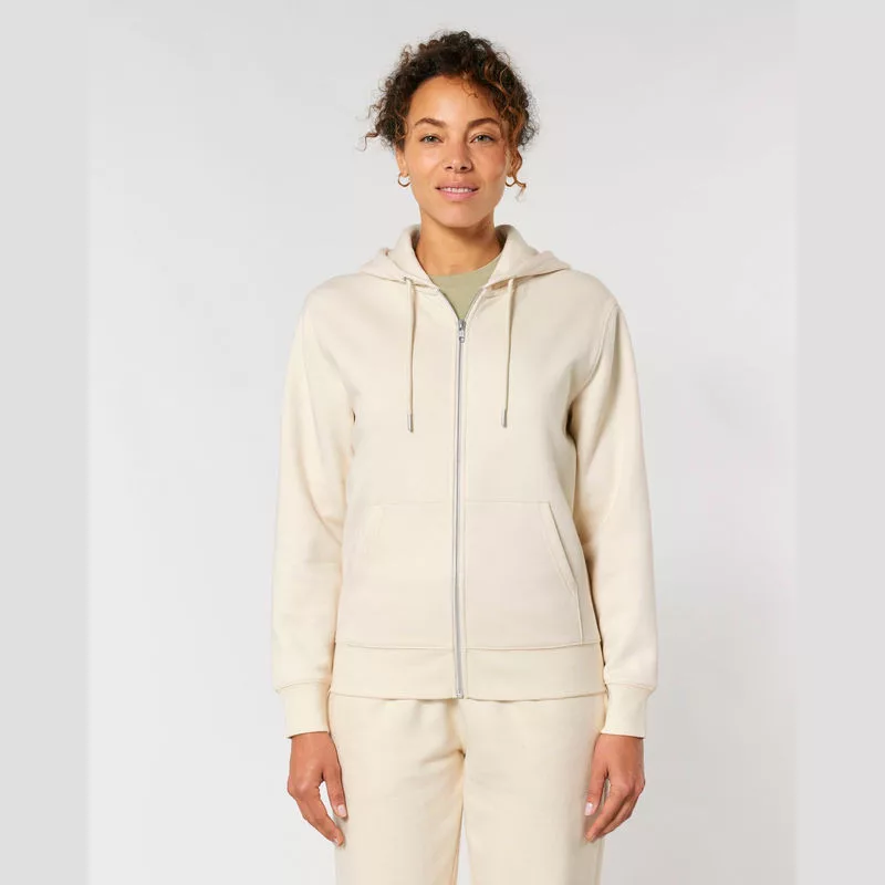 Stílusos, 350 g/m² súlyú, bolyhosított polár kapucnis pulóver modern szabásvonallal, teljes cipzárral és kenguruzsebekkel rendelkezik. 100% organikus pamutból készült.