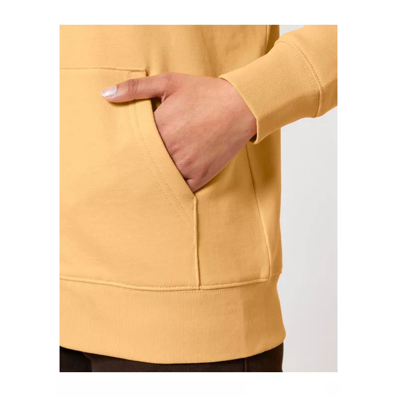 Stílusos, 350 g/m² súlyú, bolyhosított polár kapucnis pulóver modern szabásvonallal, teljes cipzárral és kenguruzsebekkel rendelkezik. 100% organikus pamutból készült.