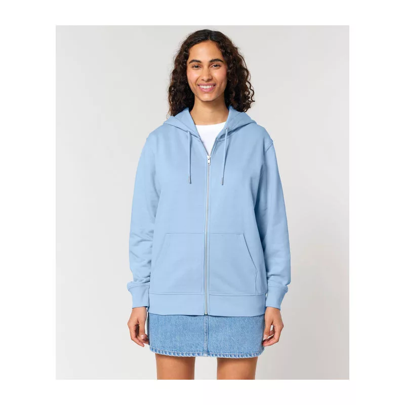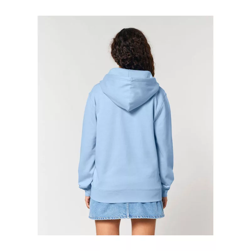 Stílusos, 350 g/m² súlyú, bolyhosított polár kapucnis pulóver modern szabásvonallal, teljes cipzárral és kenguruzsebekkel rendelkezik. 100% organikus pamutból készült.
