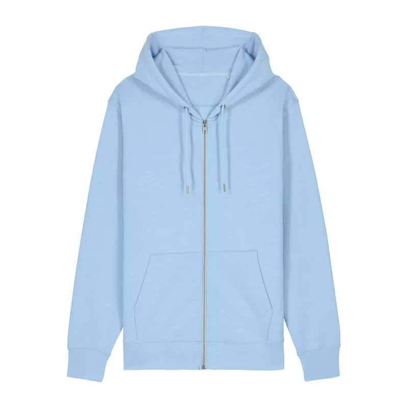 Stílusos, 350 g/m² súlyú, bolyhosított polár kapucnis pulóver modern szabásvonallal, teljes cipzárral és kenguruzsebekkel rendelkezik. 100% organikus pamutból készült.