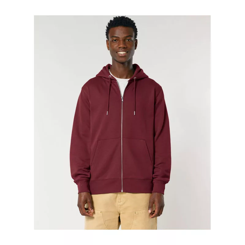 Stílusos, 350 g/m² súlyú, bolyhosított polár kapucnis pulóver modern szabásvonallal, teljes cipzárral és kenguruzsebekkel rendelkezik. 100% organikus pamutból készült.