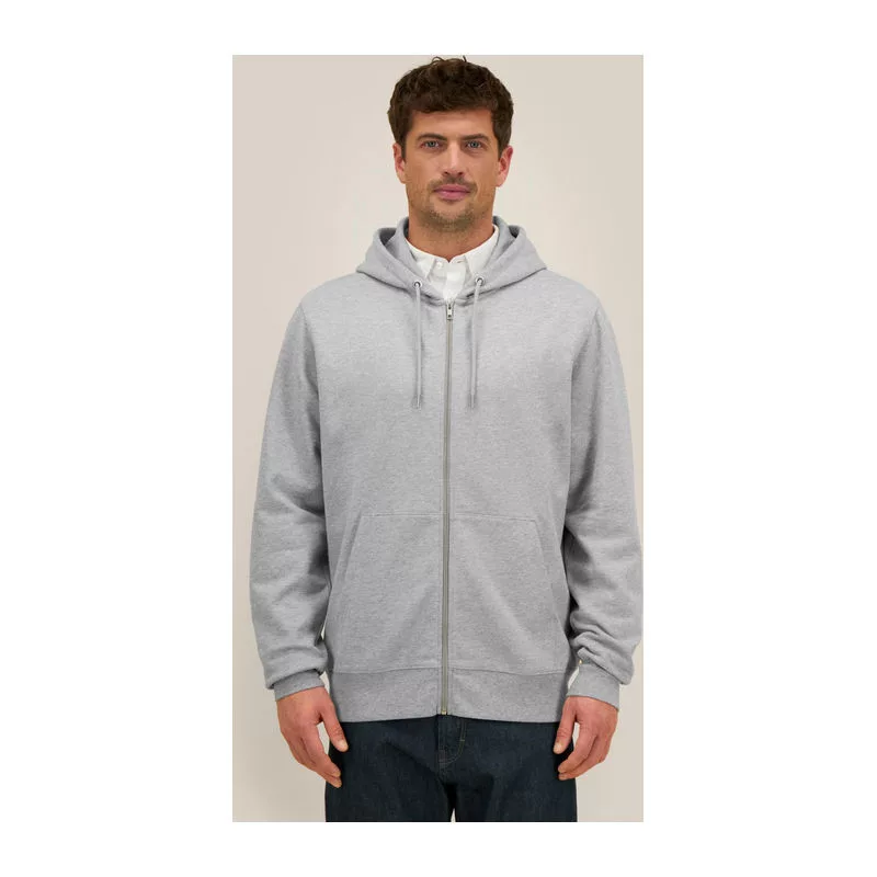 Stílusos, 350 g/m² súlyú, bolyhosított polár kapucnis pulóver modern szabásvonallal, teljes cipzárral és kenguruzsebekkel rendelkezik. 100% organikus pamutból készült.
