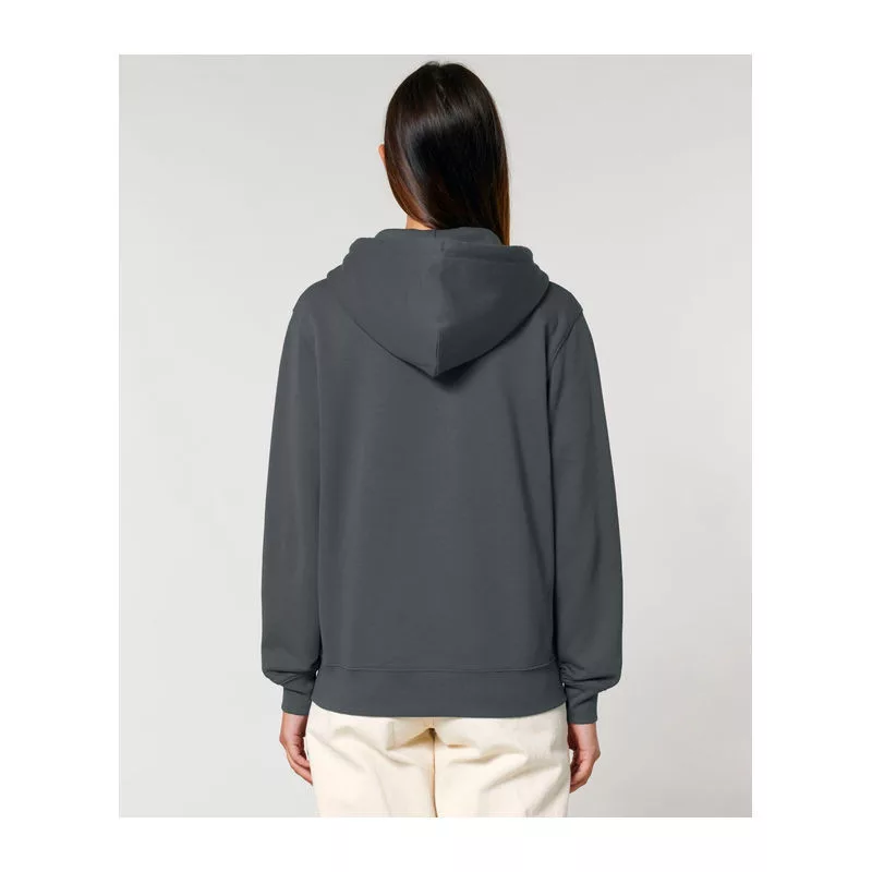 Stílusos, 350 g/m² súlyú, bolyhosított polár kapucnis pulóver modern szabásvonallal, teljes cipzárral és kenguruzsebekkel rendelkezik. 100% organikus pamutból készült.