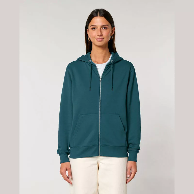 Stílusos, 350 g/m² súlyú, bolyhosított polár kapucnis pulóver modern szabásvonallal, teljes cipzárral és kenguruzsebekkel rendelkezik. 100% organikus pamutból készült.