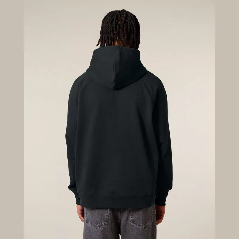 Retro stílusú, uniszex kapucnis pulóver raglán ujjakkal, dupla rétegű kapucnival és kenguruzsebbel. 100% organikus pamutból készült, 400 g/m² súlyú anyagból, amely kényelmes és laza viseletet biztosít. Kiválóan alkalmas személyre szabásra.