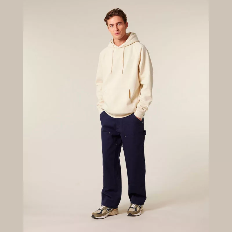 Retro stílusú, uniszex kapucnis pulóver raglán ujjakkal, dupla rétegű kapucnival és kenguruzsebbel. 100% organikus pamutból készült, 400 g/m² súlyú anyagból, amely kényelmes és laza viseletet biztosít. Kiválóan alkalmas személyre szabásra.
