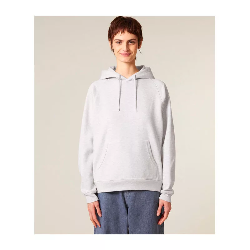 Retro stílusú, uniszex kapucnis pulóver raglán ujjakkal, dupla rétegű kapucnival és kenguruzsebbel. 100% organikus pamutból készült, 400 g/m² súlyú anyagból, amely kényelmes és laza viseletet biztosít. Kiválóan alkalmas személyre szabásra.