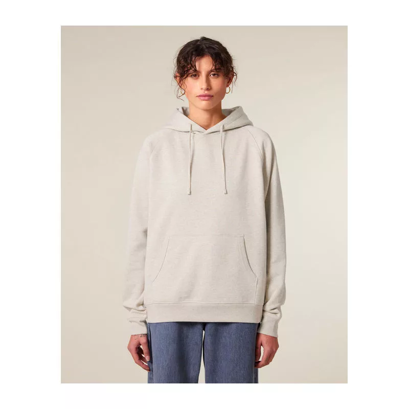 Retro stílusú, uniszex kapucnis pulóver raglán ujjakkal, dupla rétegű kapucnival és kenguruzsebbel. 100% organikus pamutból készült, 400 g/m² súlyú anyagból, amely kényelmes és laza viseletet biztosít. Kiválóan alkalmas személyre szabásra.