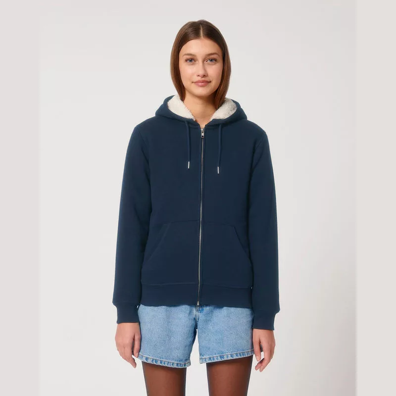 Kényelmes uniszex kapucnis pulóver újrahasznosított sherpa béléssel, kenguruzsebbel és belső mellzsebbel. Fém cipzárral, színben harmonizáló húzózsinórokkal és greige nyakszalaggal rendelkezik. Stílusos választás a hidegebb időkre.