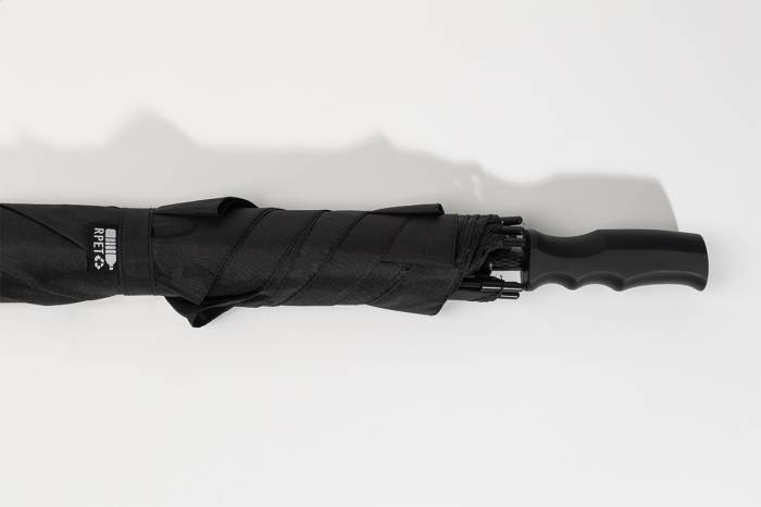 Nagy méretű, automatikus, szélálló, szögletes esernyő teljes üvegszálas szárral és vázzal, gumírozott ABS fogantyúval. 190T RPET pongee. Megkülönböztető RPET címkével.