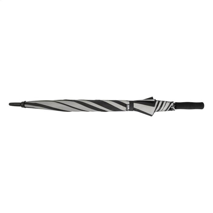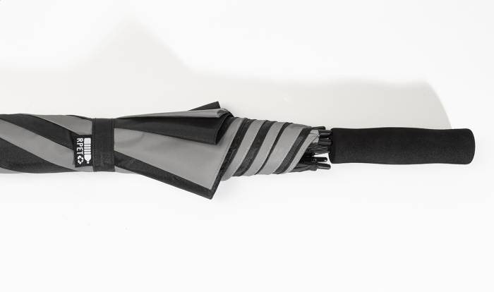 Nagy méretű, manuális, szélálló esernyő 4 panellel 190T RPET pongee és 4 panellel fényvisszaverő anyagból. Teljes üvegszálas vázzal és szárral, EVA fogantyúval. 190T RPET pongee. Megkülönböztető RPET címkével.