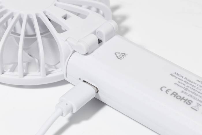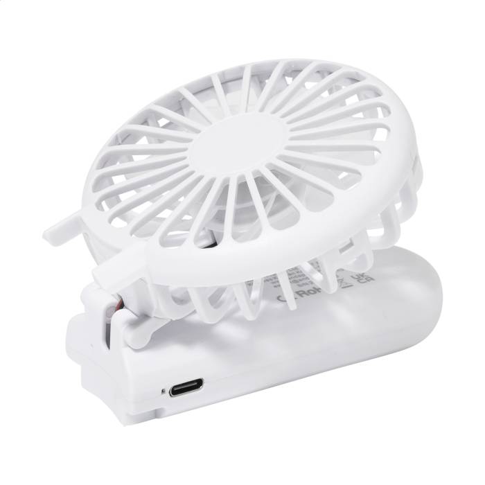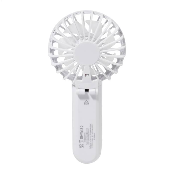 Újrahasznosított ABS elektromos kézi ventilátor beépített USB újratölthető akkumulátorral (400 mAh). Állítható szöggel és 3 sebesség fokozattal. USB töltőkábellel.