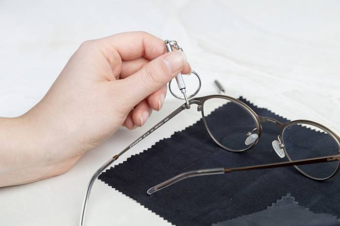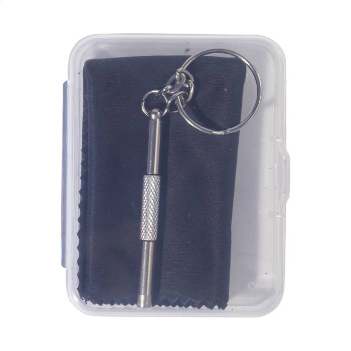 Kompakt szemüvegjavító készlet átlátszó PP dobozban. Tartalmaz egy 100% RPET mikroszálas (220 g/m²) tisztítókendőt és egy mini csavarhúzót kulcskarikával. Kendő mérete: 18 × 15 cm.