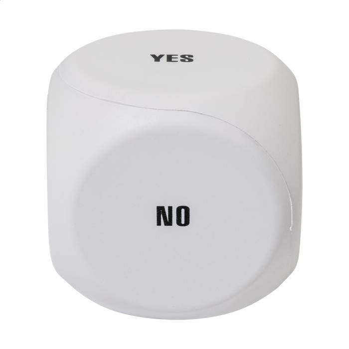 Dobókocka alakú, döntéshozó stresszlabda PU habból. A következő üzenetekkel: Tarts szünetet, Holnap, Talán, Igen, Nem, és egy üres oldallal a nyomtatáshoz.