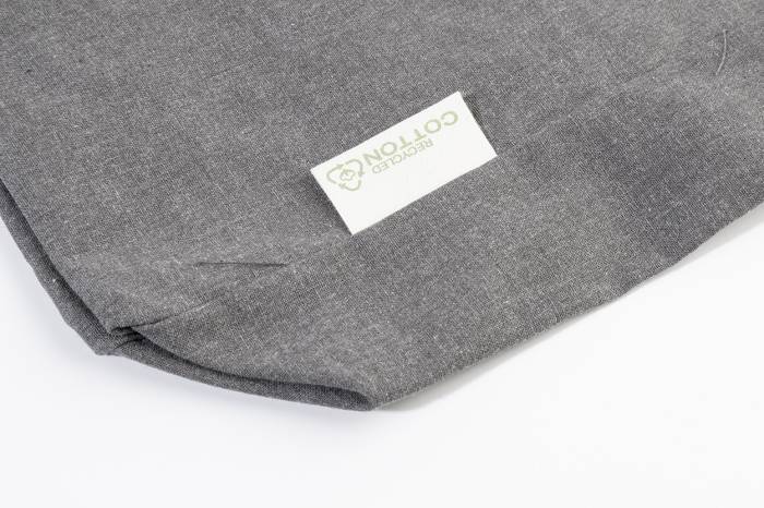 Bevásárlótáska betoldással és hosszú fülekkel, 70% újrahasznosított pamutból és 30% RPET poliészterből, 140 g/m². Megkülönböztető újrahasznosított pamut címkével.
