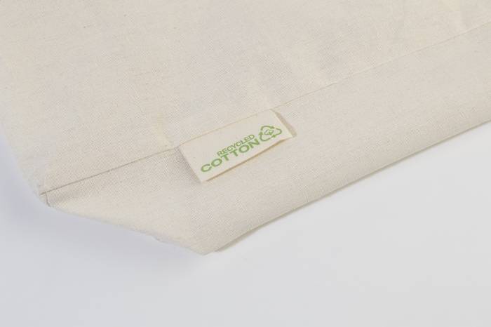 Bevásárlótáska betoldással és hosszú fülekkel, 70% újrahasznosított pamutból és 30% RPET poliészterből, 140 g/m². Megkülönböztető újrahasznosított pamut címkével.